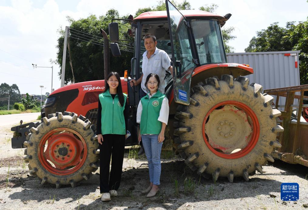 9月18日,在廣州市增城區石灘鎮石湖村石鄉農機專(zhuān)業(yè)合作社,沈燕芬(前右)、沈笑芬(前左)和父親沈燦星在農機前留影。