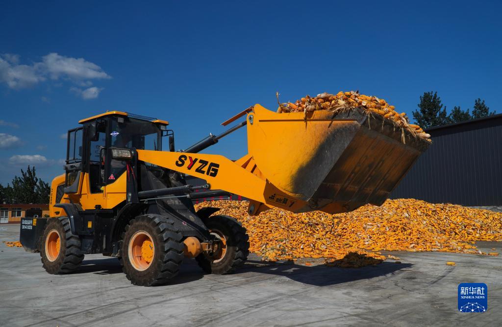 9月20日,在山東省新泰市禹村鎮,農戶(hù)利用機械設備搬運、晾曬剛收獲的玉米。
