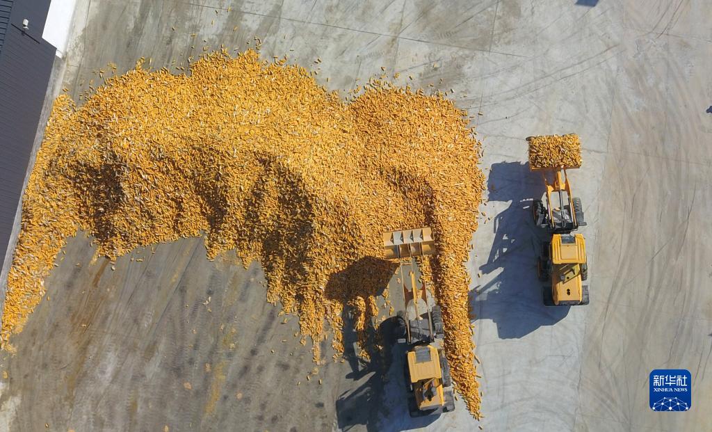 9月20日,在山東省新泰市禹村鎮,農戶(hù)利用機械設備搬運、晾曬剛收獲的玉米(無(wú)人機照片)。