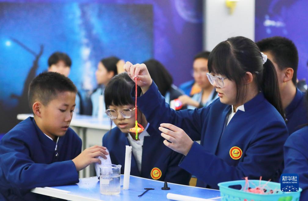 9月21日,在內蒙古阿拉善盟額濟納旗,學(xué)生在做趣味實(shí)驗。