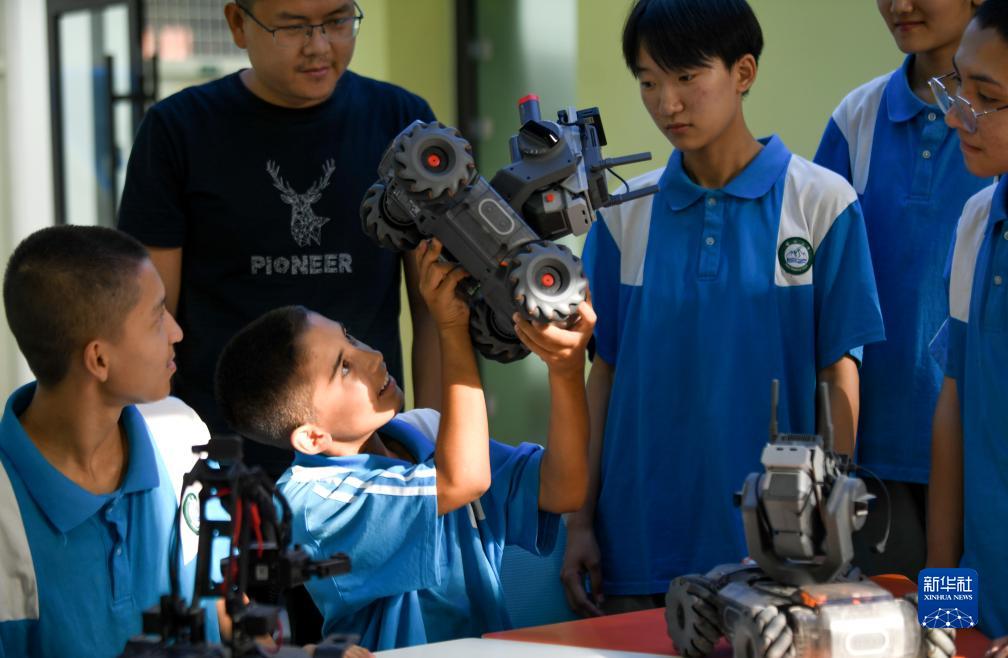 在新疆喀什第二中學(xué),教師程應超(后)指導九年級的同學(xué)們學(xué)習機器人知識(9月7日攝)。