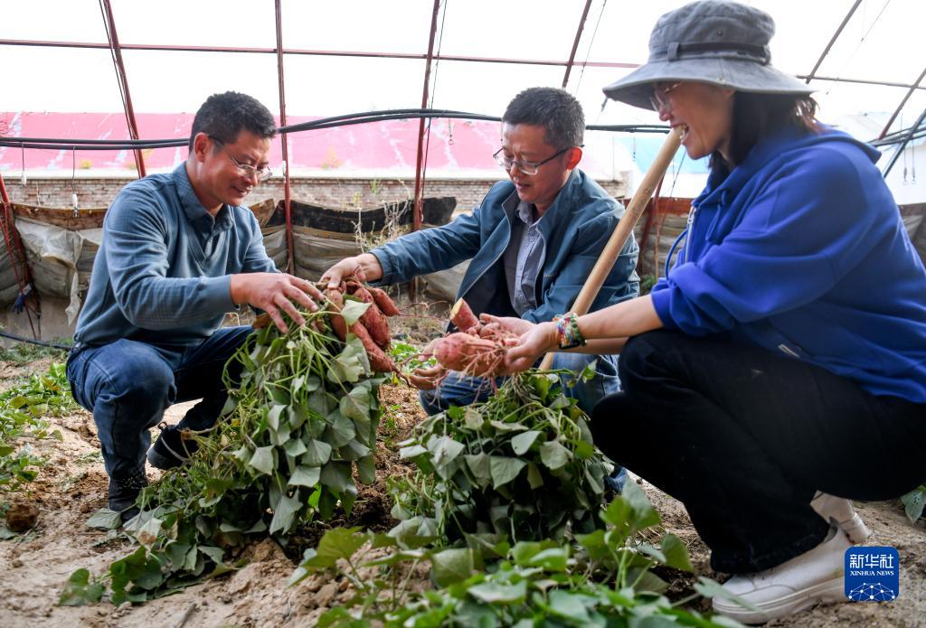 在福建漳州援建的木壘縣農業(yè)產(chǎn)業(yè)示范園里,來(lái)自福建省南平市光澤縣農業(yè)農村局的援疆干部呂軍(左)、來(lái)自福建省武夷山市經(jīng)濟作物技術(shù)站的援疆干部黃文慶(中)和來(lái)自福建省漳州市農業(yè)農村局的黃素英在一起探討試種的新品種番薯生長(cháng)情況(9月20日攝)。