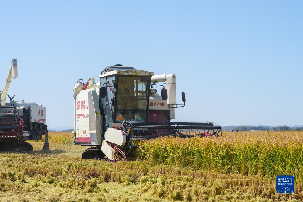 這是9月21日在位于雙鴨山市友誼縣的北大荒農業(yè)股份有限公司友誼分公司一地塊拍攝的水稻收獲現場(chǎng)。