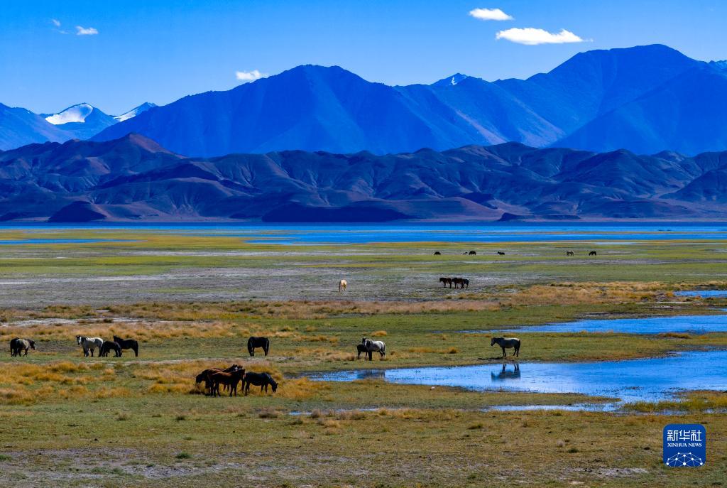鳥(niǎo)瞰班公湖畔的濕地(無(wú)人機照片,9月21日攝)。