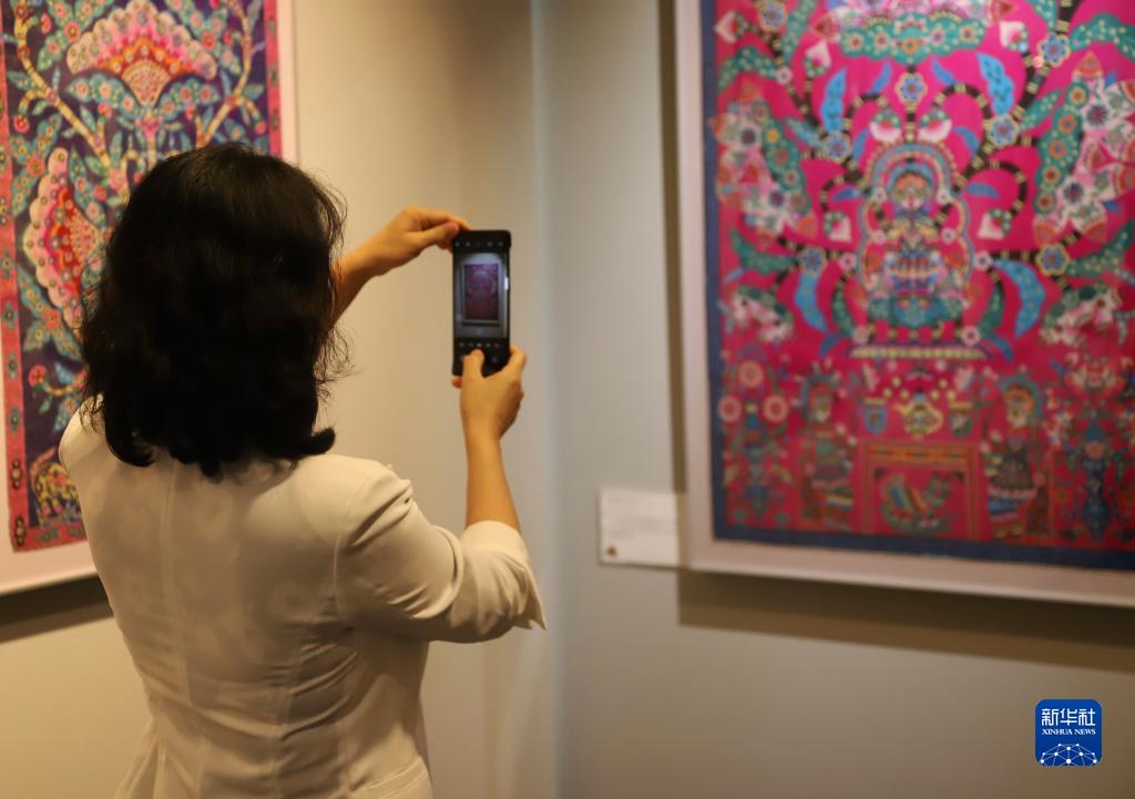 9月21日,一名參觀(guān)者在日本東京舉行的庫淑蘭剪紙藝術(shù)展預展上拍照。