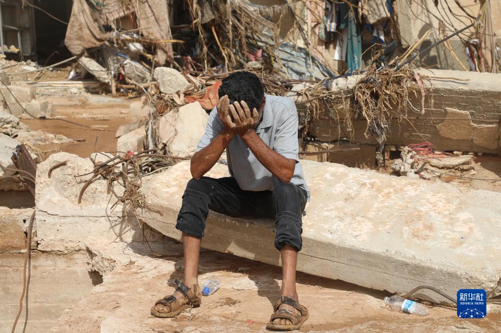 9月15日,在利比亞?wèn)|部城市德?tīng)柤{, 一名男子坐在被洪水摧毀的房子前。