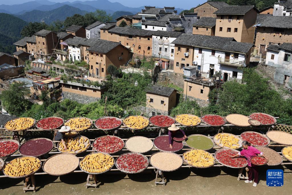 9月18日,在黃山市歙縣陽(yáng)產(chǎn)村,村民在曬場(chǎng)上晾曬農作物。