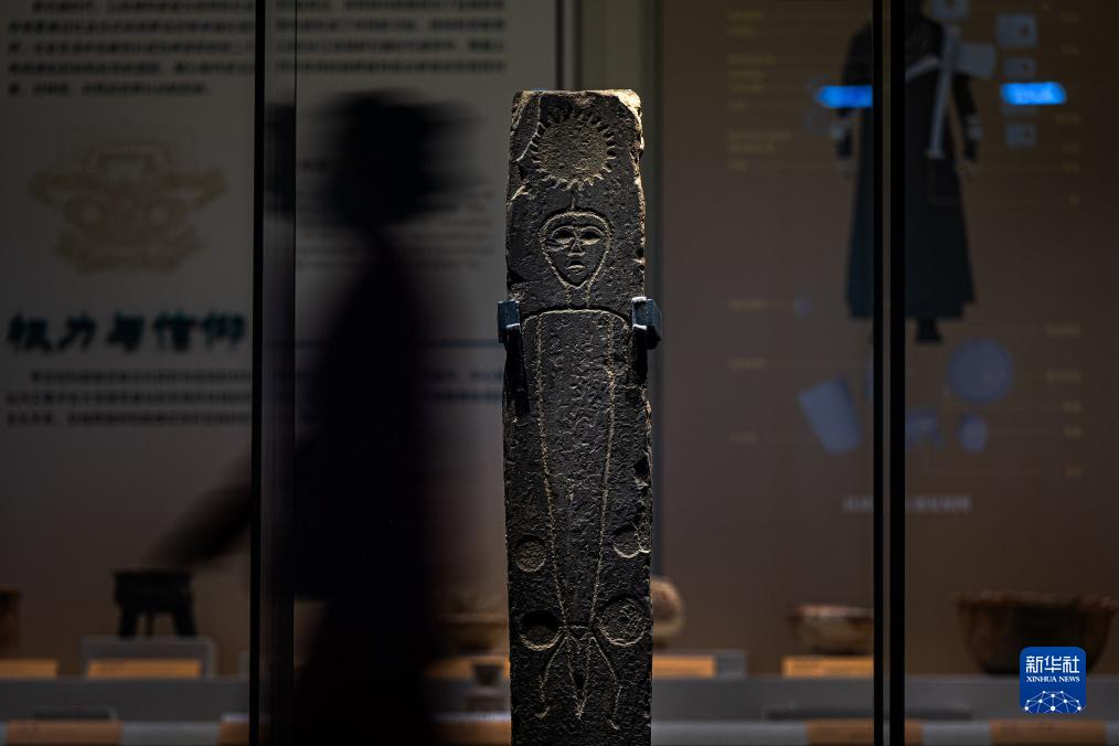 9月23日,參觀(guān)者在湖北省博物館長(cháng)江文明特展上觀(guān)看展出的太陽(yáng)人石刻。
