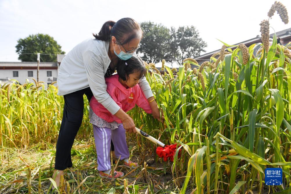 9月23日,一位家長(cháng)帶著(zhù)小朋友在北京先農壇耤田內體驗收割稷。