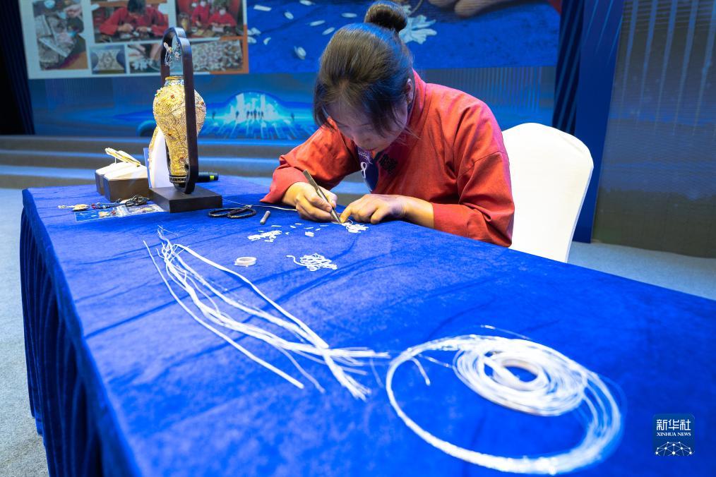 9月21日,選手李靜在現場(chǎng)展示花絲首飾制作技藝。