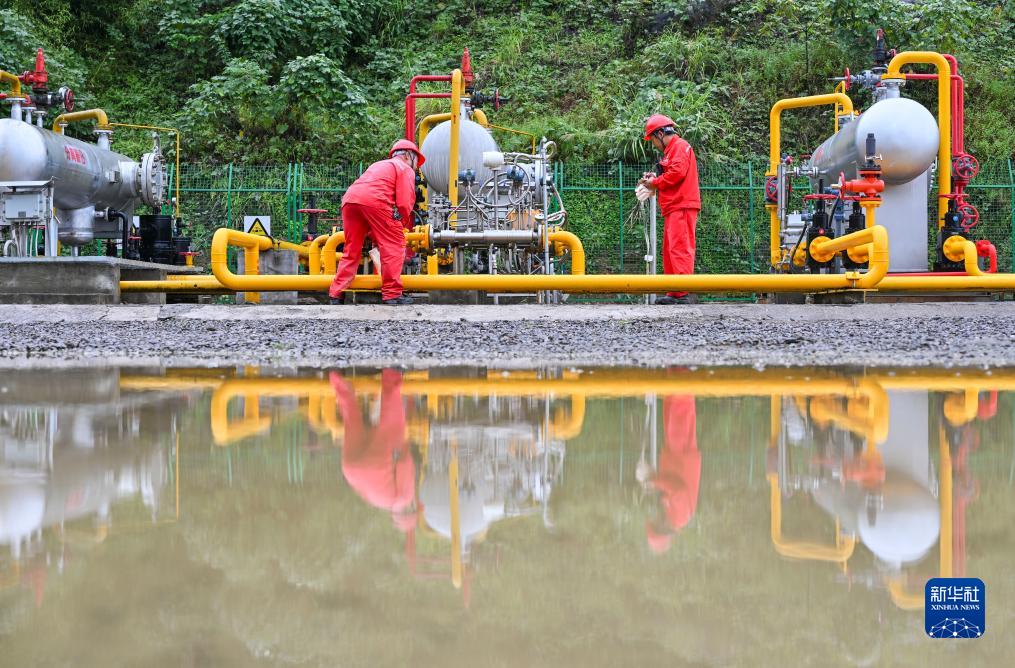 技術(shù)人員在位于重慶涪陵的涪陵頁(yè)巖氣田焦頁(yè)26號西集氣站對設備進(jìn)行日常檢查維護(9月21日攝)。