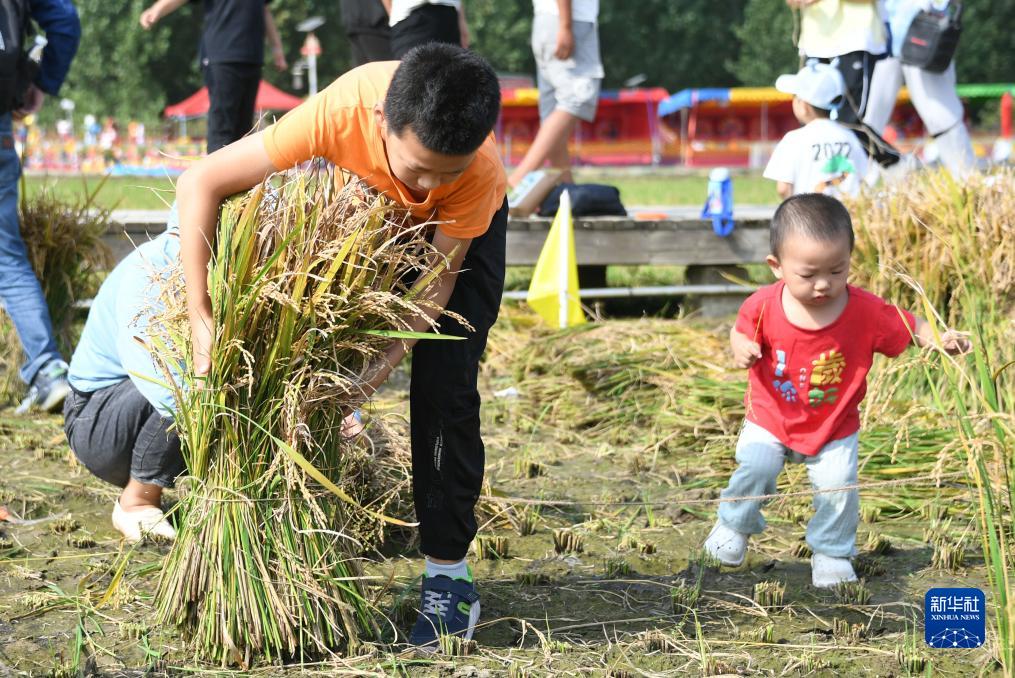 9月23日,在北京市海淀區上莊鎮西馬坊京西稻田,小朋友在活動(dòng)中參加割稻子比賽。