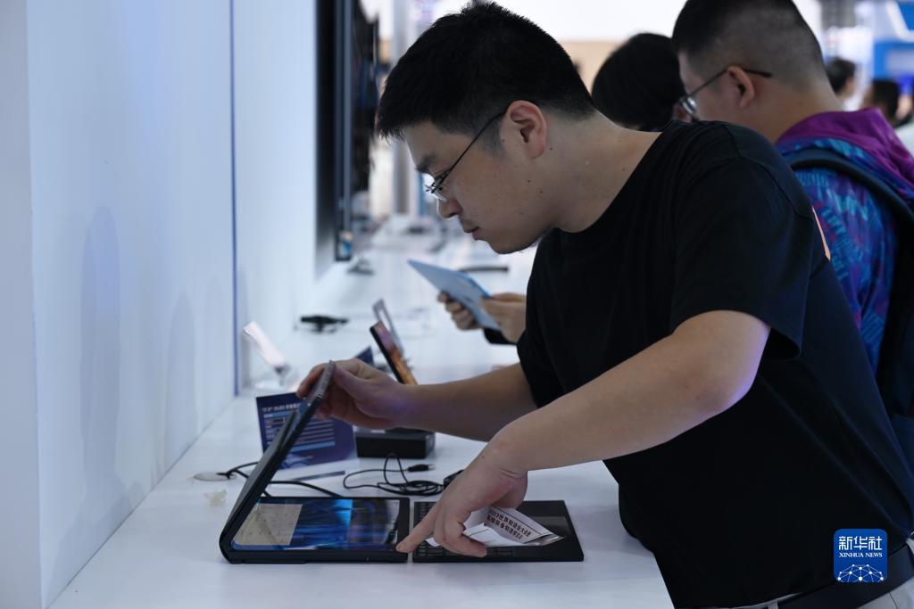 9月22日,觀(guān)眾在2023世界制造業(yè)大會(huì )集成電路與新型顯示展區體驗一款OLED折疊筆記本。