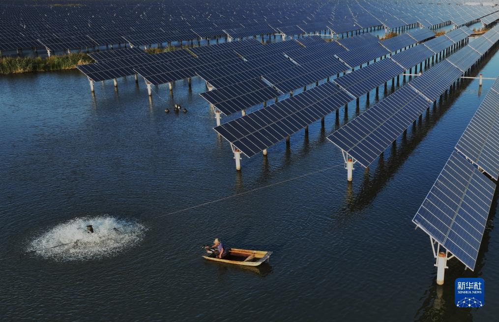 9月16日,在河北省唐山市豐南區黑沿子鎮“漁光一體”現代漁業(yè)產(chǎn)業(yè)園,漁民在魚(yú)塘里工作(無(wú)人機照片)。