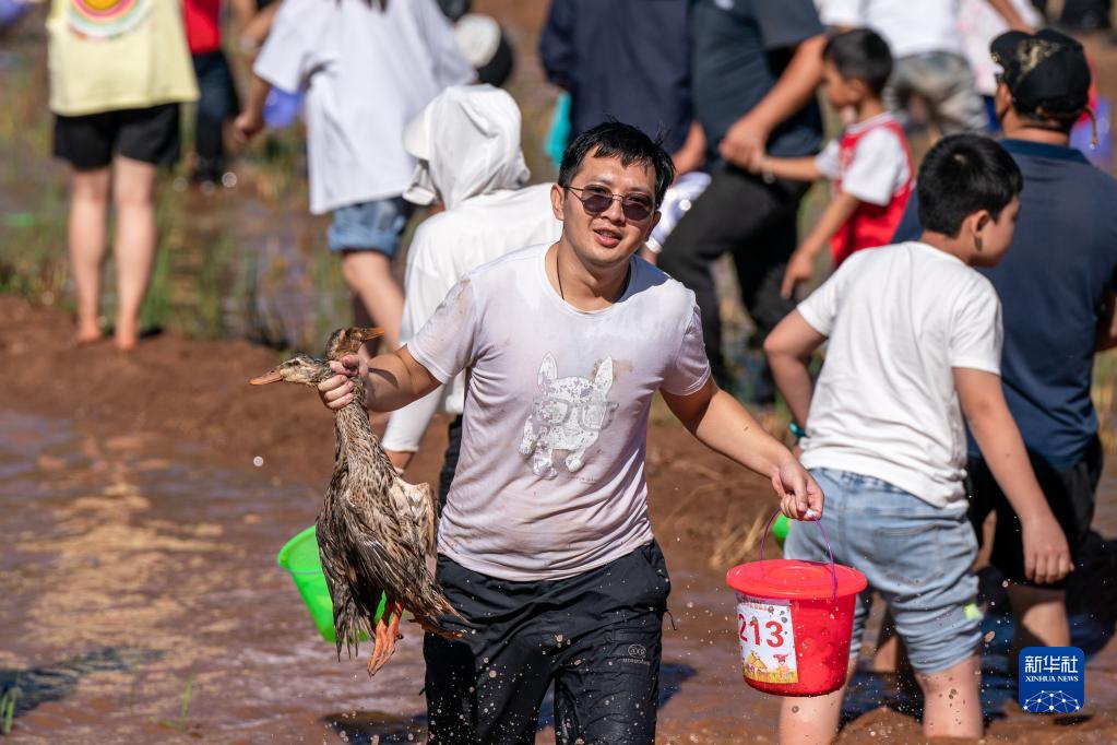 當日,云南省昆明市東川區開(kāi)展稻田摸魚(yú)、攆鴨、捉蛙等活動(dòng),在稻花香里慶豐收。