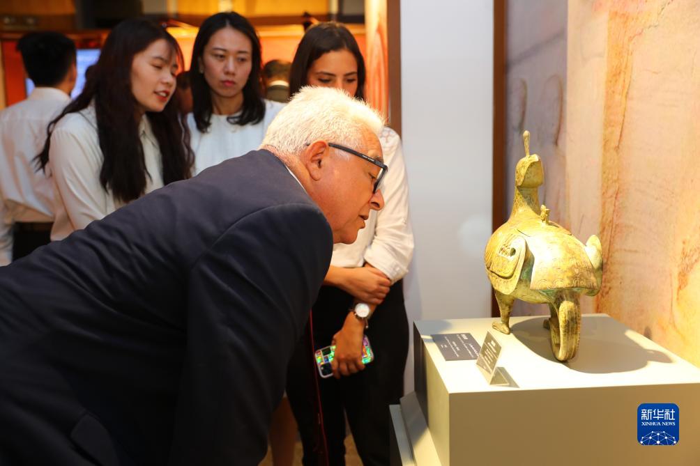 9月23日,一名參觀(guān)者在埃及開(kāi)羅舉行的天龍山石窟數字復原國際巡展上觀(guān)看展品。