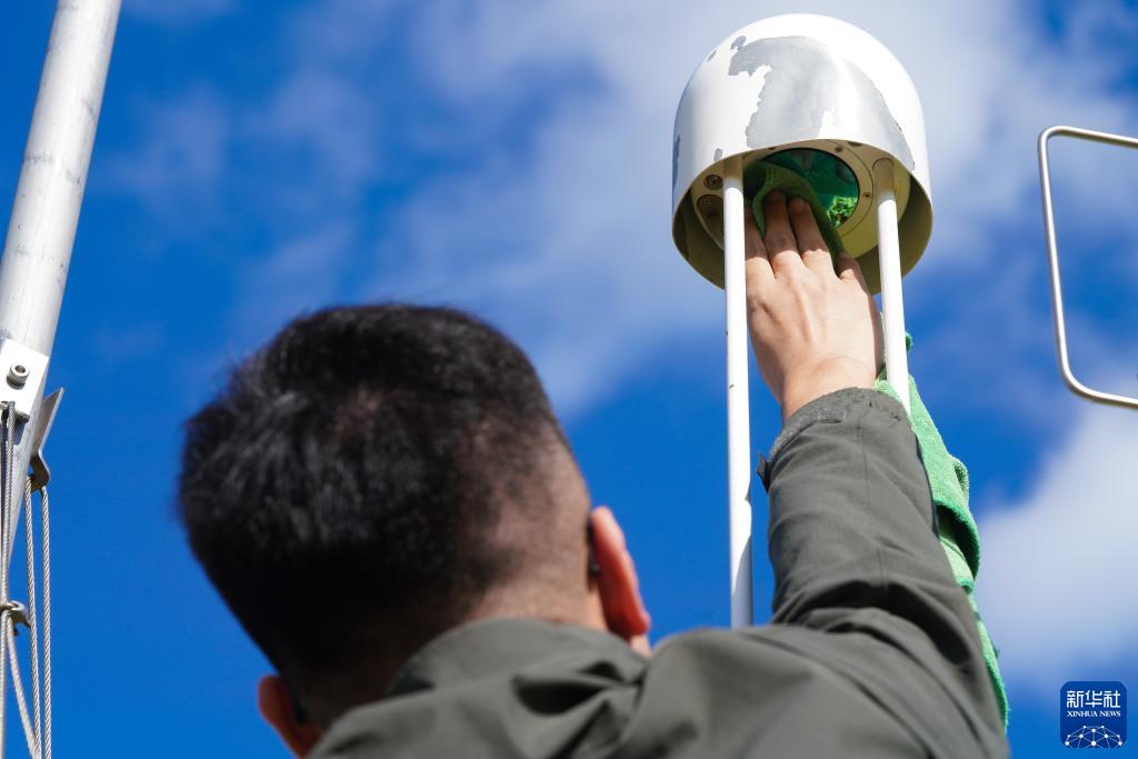 在富錦市現代農業(yè)萬(wàn)畝水稻科技示范園實(shí)驗基地,氣象員王國泰在維護農業(yè)氣象觀(guān)測儀器(9月22日攝)。