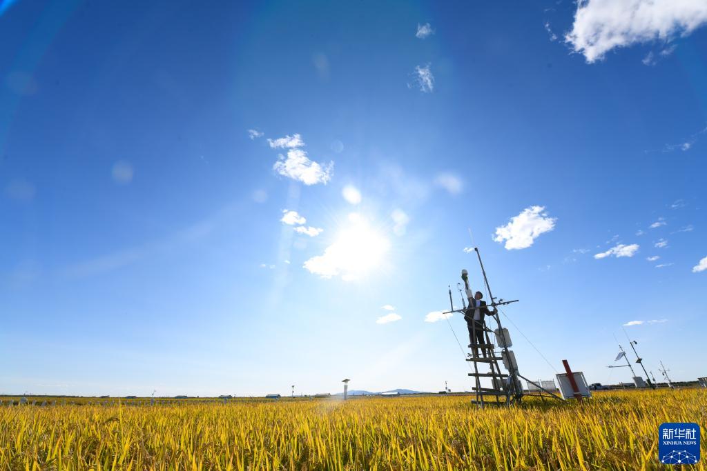 在富錦市現代農業(yè)萬(wàn)畝水稻科技示范園實(shí)驗基地,氣象員王國泰在維護農業(yè)氣象觀(guān)測儀器(9月22日攝)。