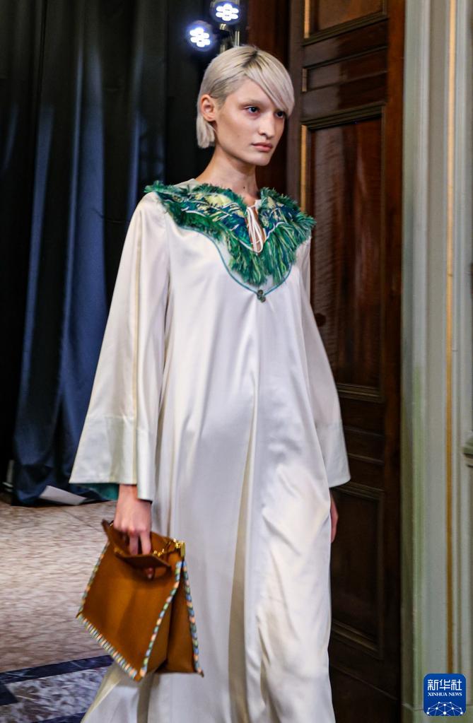 9月23日,模特在意大利米蘭時(shí)裝周上展示楚雄彝繡女裝。