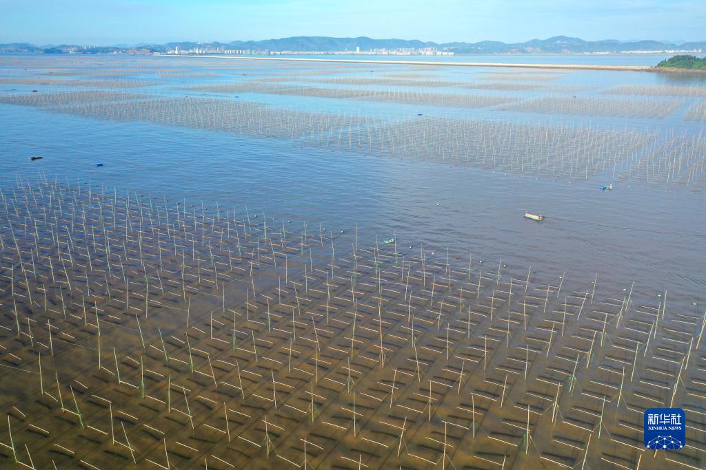 9月24日在玉環(huán)市干江鎮下礁門(mén)淺海水域拍攝的紫菜養殖區(無(wú)人機照片)。