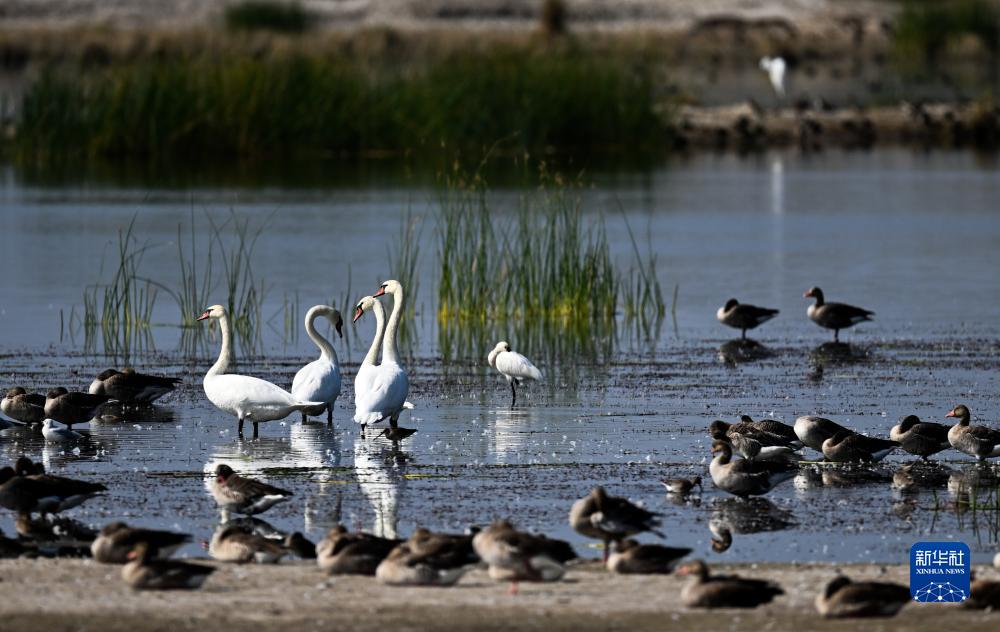 9月24日,疣鼻天鵝在烏梁素海湖面上。
