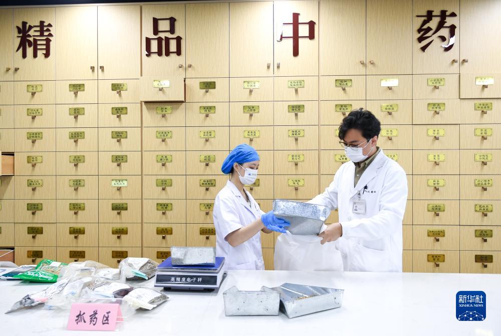 9月4日,郭鈞泯(右)在深圳市中醫藥傳承發(fā)展研究院的藥房幫助同事抓藥。