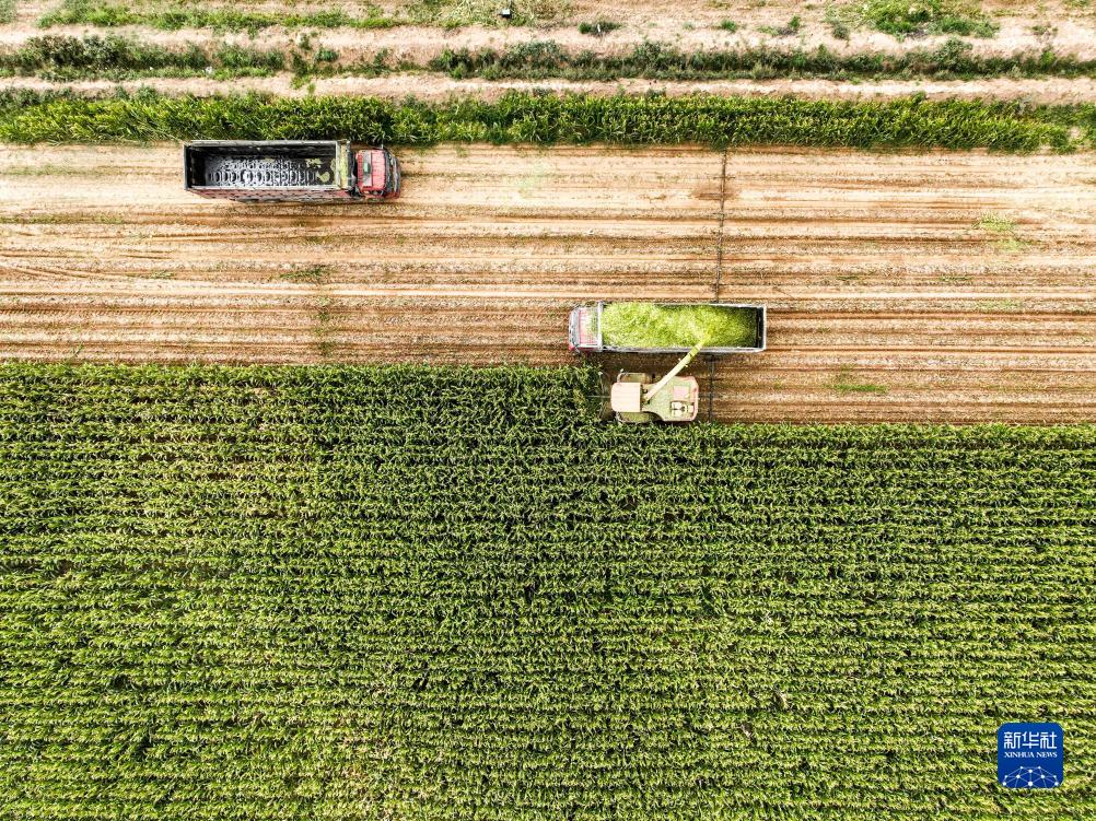 在內蒙古巴彥淖爾市臨河區城關(guān)鎮,收割機在收割青儲玉米(無(wú)人機照片,9月14日攝)。