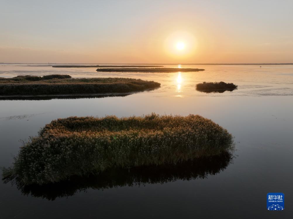 烏梁素海落日美景(無(wú)人機照片,9月13日攝)。