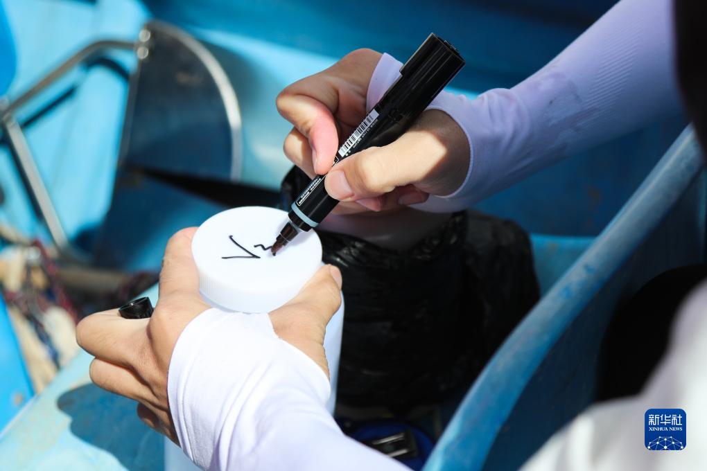 9月15日,團隊成員劉瑩慧在湖水樣品瓶上標注。