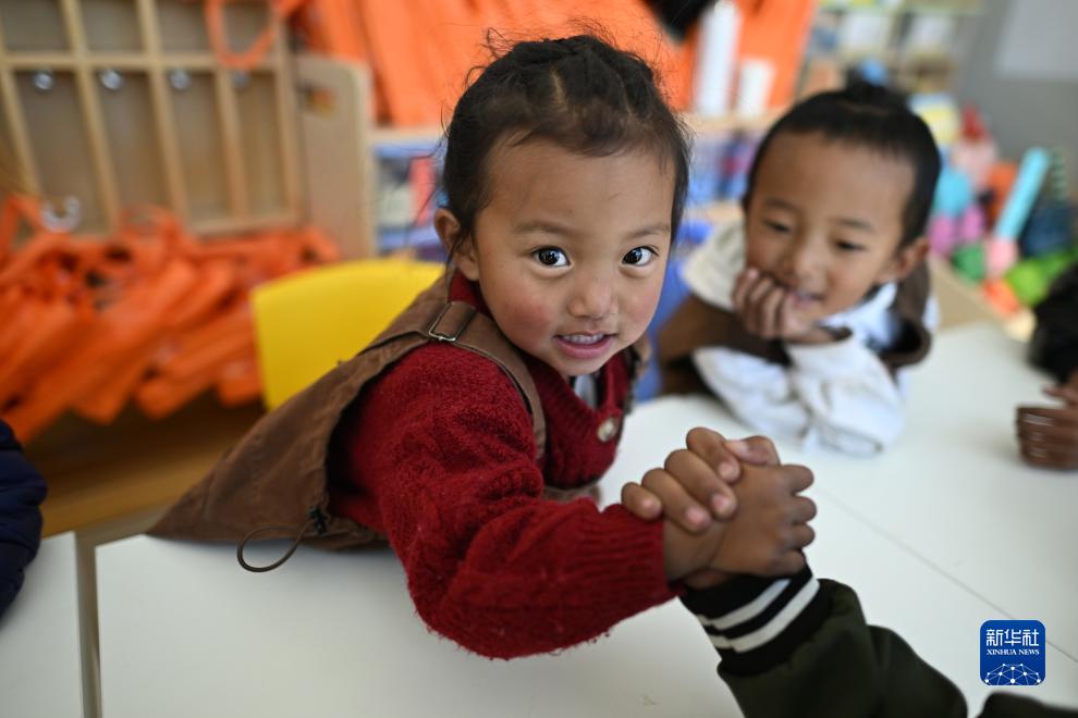 在青海省玉樹(shù)藏族自治州曲麻萊縣秋智鄉布甫村陽(yáng)光幼兒園,丁增巴桑(左)和伙伴們在教室內玩耍(9月14日攝)。