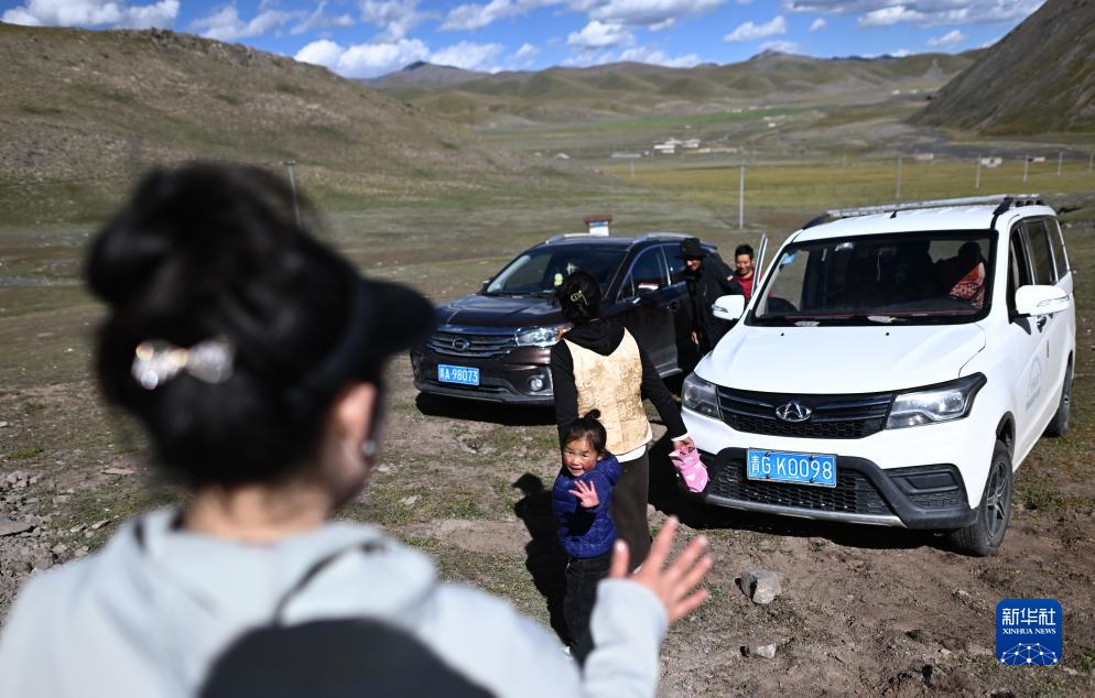 在青海省玉樹(shù)藏族自治州曲麻萊縣秋智鄉布甫村陽(yáng)光幼兒園,孩子們在放學(xué)后與老師告別(9月14日攝)。
