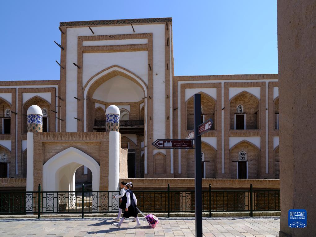 9月22日,在烏茲別克斯坦花拉子模州的希瓦古城,兒童從修復一新的的阿米爾·圖拉經(jīng)學(xué)院前走過(guò)。