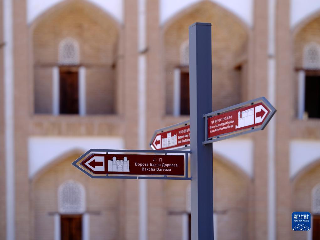這是9月22日在烏茲別克斯坦花拉子模州的希瓦古城拍攝的古建筑路標。路標指示出阿米爾·圖拉經(jīng)學(xué)院和哈?!つ吕聨焓矂e吉清真寺的位置,并有中文標示。