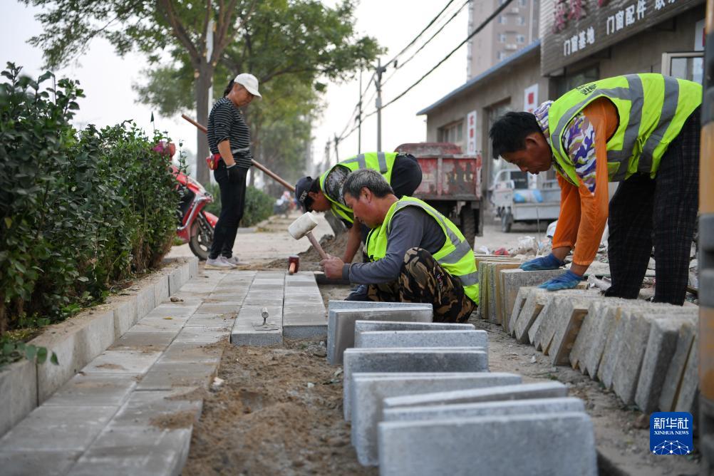 9月26日,在107國道河北保定涿州段便道上,工人在修復遭受洪水破壞的路面。