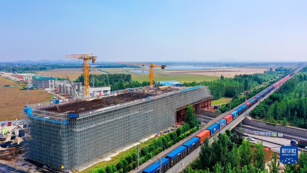9月29日拍攝的濟(寧)曲(阜)快速路上跨京滬鐵路立交橋項目(無(wú)人機照片)。