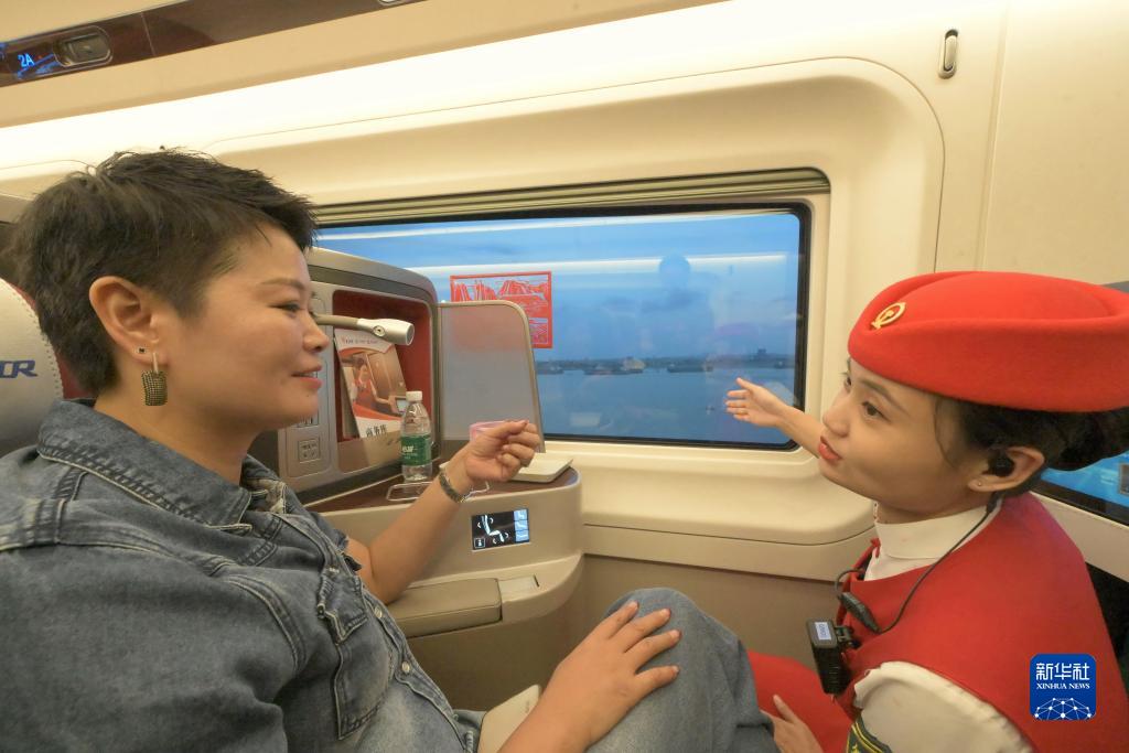 9月28日,G9801次復興號智能動(dòng)車(chē)組經(jīng)過(guò)泉州灣跨海大橋時(shí),列車(chē)長(cháng)車(chē)艷雪(右)向旅客介紹福廈高鐵泉州灣的海上風(fēng)光。