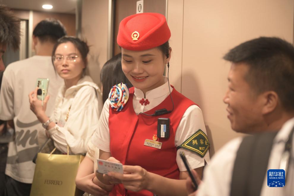 首發(fā)車(chē)G9801次列車(chē)長(cháng)車(chē)艷雪和她的同事登上福廈高鐵復興號智能動(dòng)車(chē)組為乘客服務(wù)?!霸诹熊?chē)上我們要用心用情做好服務(wù),讓乘坐福廈高鐵的乘客在旅行中享受到不一樣的跨海之旅,展現我們海上‘高姐’的風(fēng)采?!避?chē)艷雪說(shuō)。