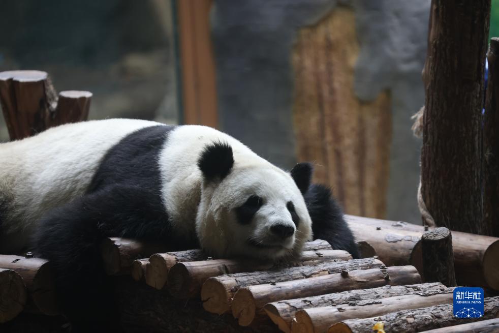 9月29日,西寧熊貓館的一只大熊貓在休息。