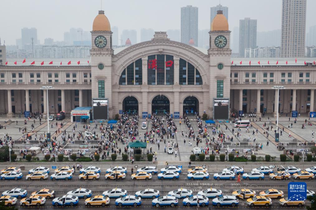 9月29日,旅客在漢口站排隊進(jìn)站(無(wú)人機照片)。