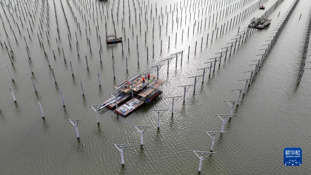 9月29日,工人在河北省唐山市豐南區黑沿子鎮“漁光一體”現代漁業(yè)產(chǎn)業(yè)園二期工程建設工地施工。