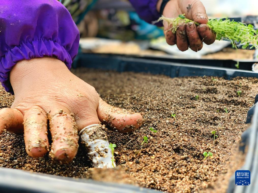 5月21日,當地農民將原原種幼苗栽進(jìn)培養土中。