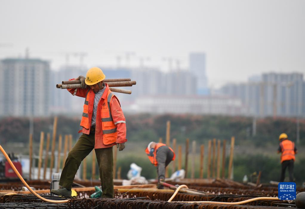 9月30日,中建三局西北公司工人在西安國際港務(wù)區歐亞大道上跨貨運北環(huán)線(xiàn)高架工程施工。