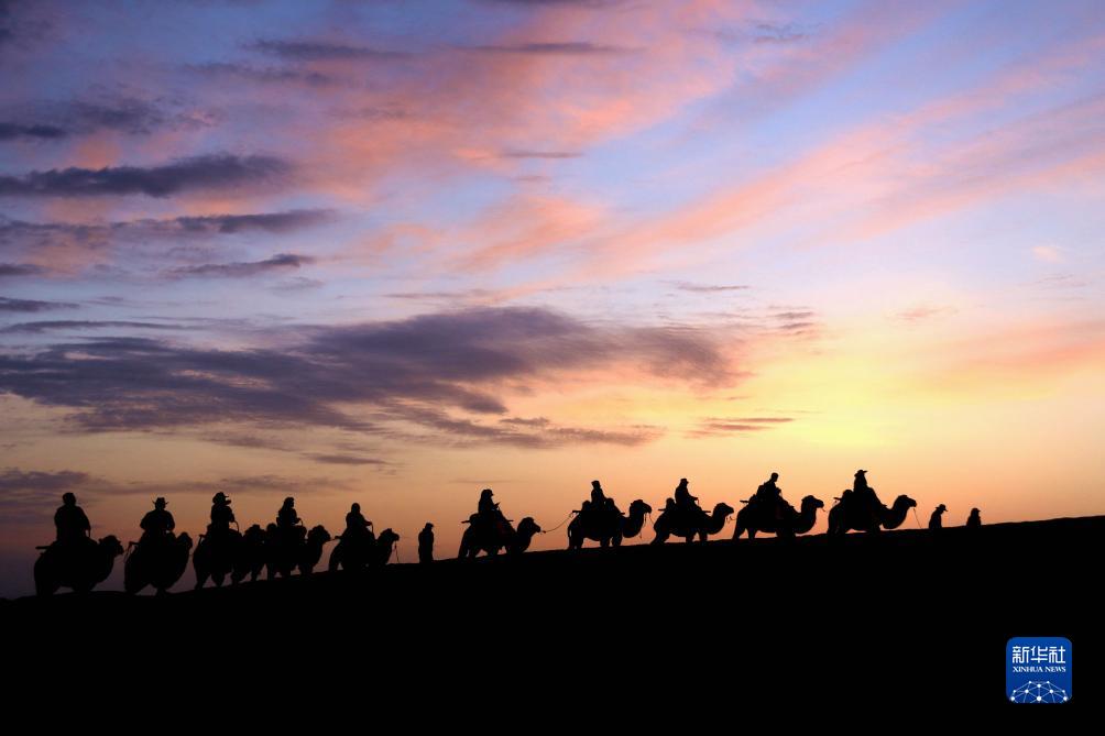 10月1日,在甘肅省敦煌市鳴沙山月牙泉景區,游客在晨光中騎駱駝?dòng)斡[。