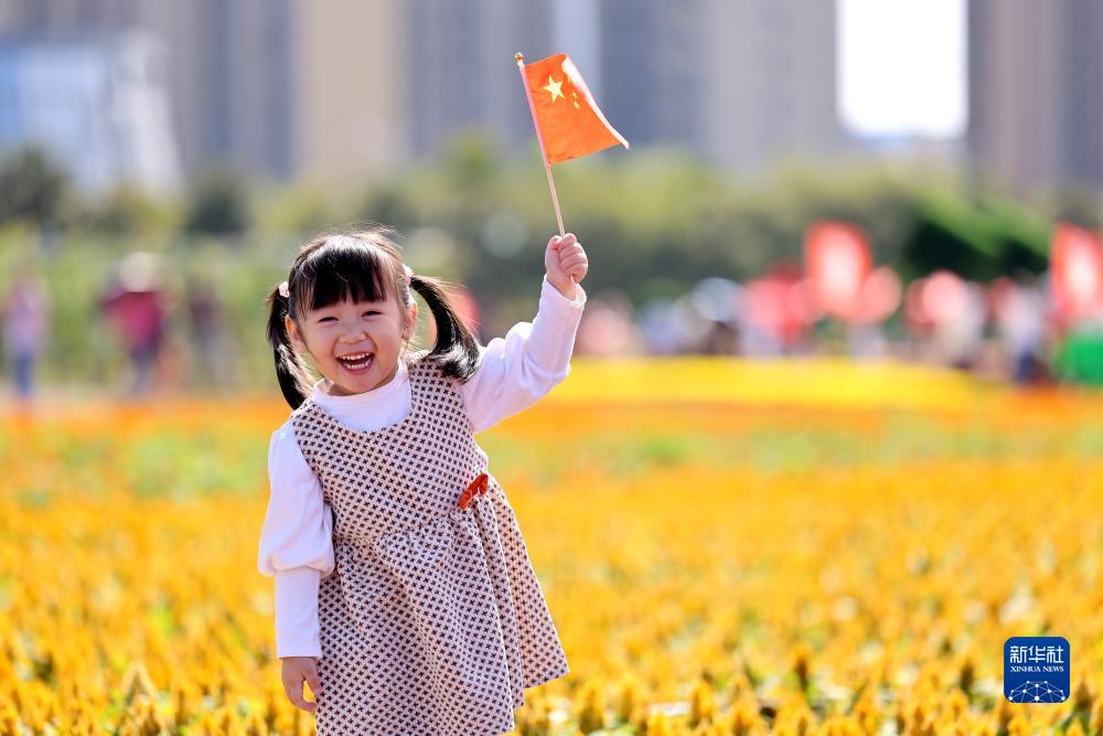10月1日,小朋友在山東省棗莊市一處花海景點(diǎn)游玩。