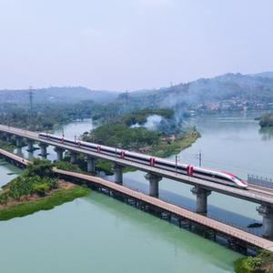 這是9月30日在印度尼西亞普哇加達拍攝的一列行駛中的雅萬(wàn)高鐵高速動(dòng)車(chē)組(無(wú)人機照片)。