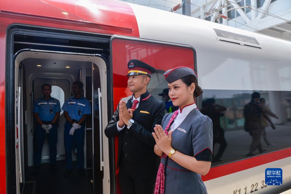 10月2日,在印度尼西亞帕達拉朗車(chē)站,乘務(wù)人員歡迎乘客和嘉賓。