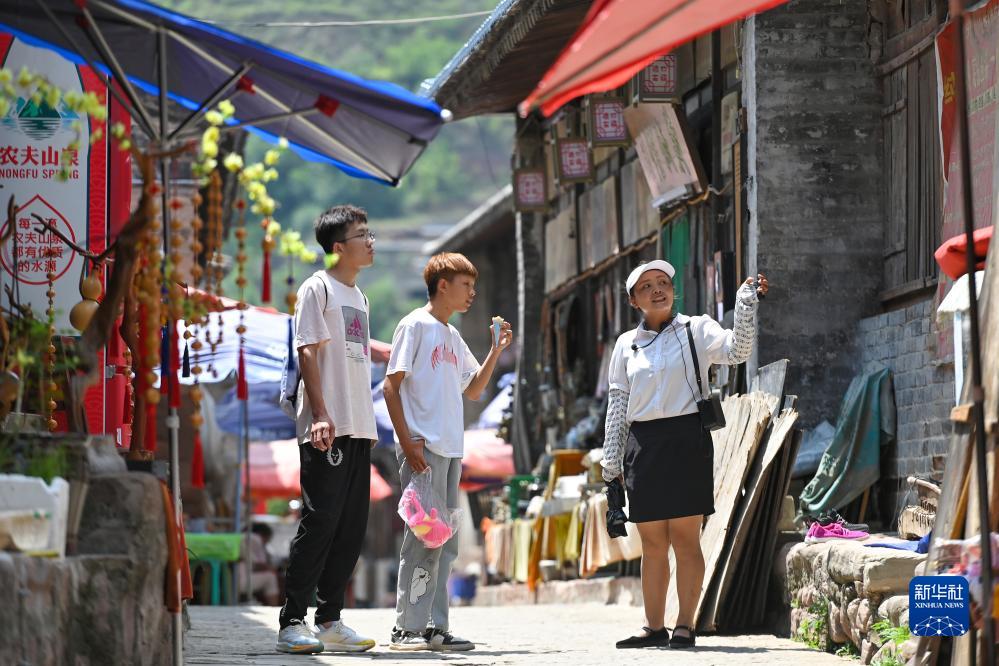 在山西磧口古鎮,導游張珍花(右)為游客講解古鎮歷史(8月2日攝)。村民張珍花2006年開(kāi)始從事磧口古鎮導游工作。