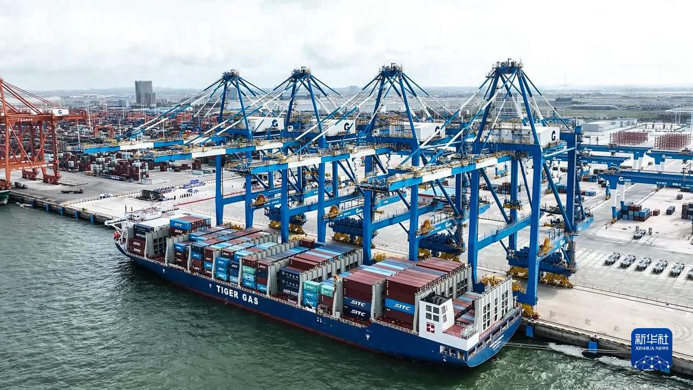 10月2日,一艘海輪??繗J州港自動(dòng)化碼頭卸貨(無(wú)人機照片)。