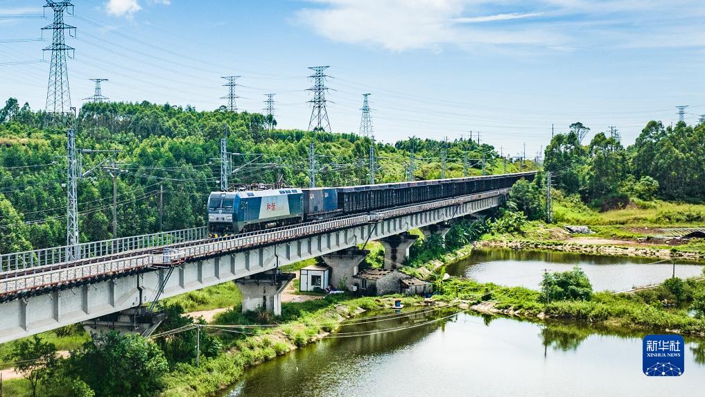 10月2日,滿(mǎn)載貨物的列車(chē)從欽州港東站駛出(無(wú)人機照片)。