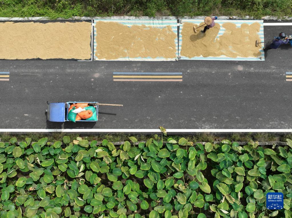 10月2日,福建省永泰縣白云鄉村民在晾曬剛收獲的水稻(無(wú)人機照片)。